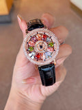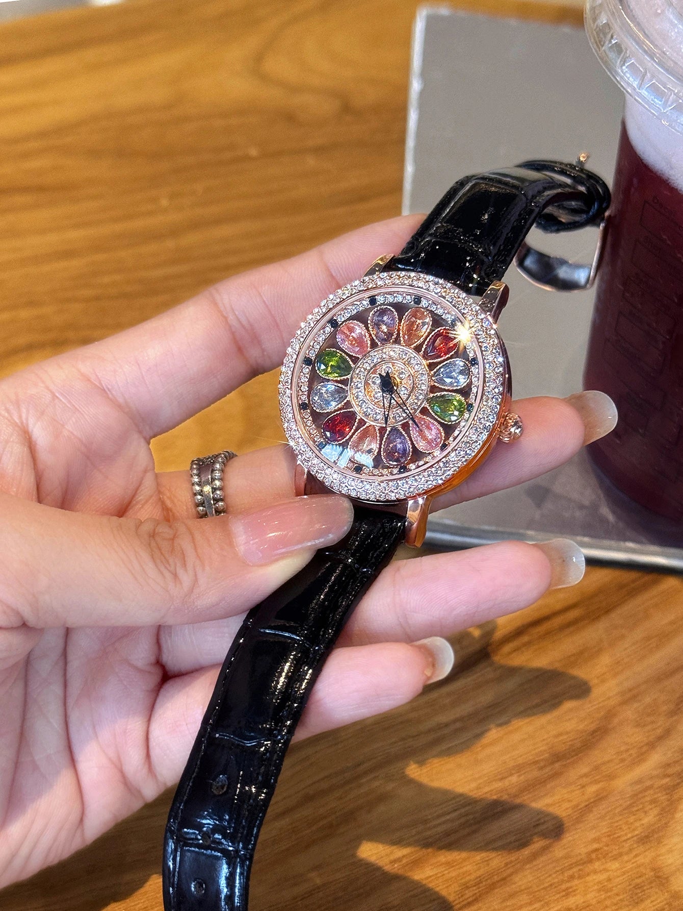 A dazzling and stylish luxury women's watch, quartz watch set with colored rhinestones and featuring a captivating rotating dial