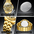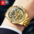 OLEVS Lxuxry Brand Gold Men's Watches Full Skeleton Stainless steel Chronograph Wristwatch Waterproof Luminous Quartz Watch Men