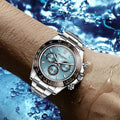 With a 300-meter water resistance rating, it's the ideal companion for water sports and adventures. Whether swimming in the pool or enjoying a thrilling ride in the rain, it handles it with confidence. The screw-down crown acts as a loyal guardian, completely isolating water when tightened, providing comprehensive protection for the delicate movement, allowing you to explore the underwater world without worry.